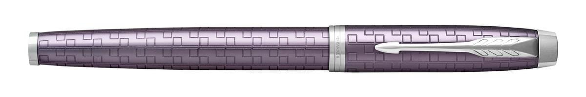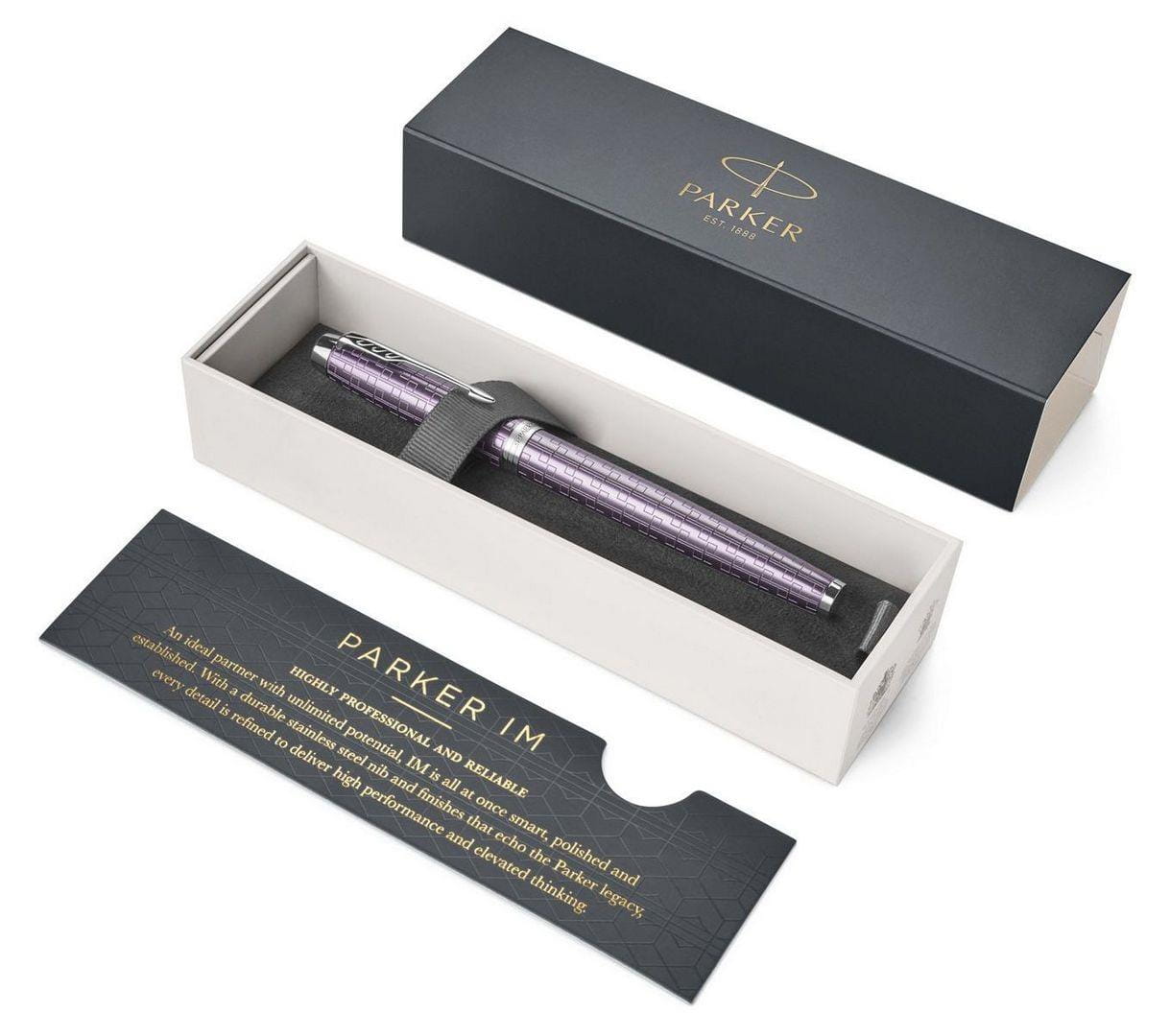 To pióro kulkowe to solidny partner. Inteligentny, pewny i profesjonalny. Linia Parker IM to wykończenia oddające najlepszą tradycję marki. Każdy detal pióra kulkowego IM Premium zaprojektowany został tak, by zapewnić niezawodność pisania. Aluminiowy korpus jest polerowany, anodowany na głęboką barwę fioletu i dodatkowo grawerowany laserem. Grawerowany wzór jest ponadczasowy, subtelnie podkreśla wykończenia. Pierścienie chromowane.