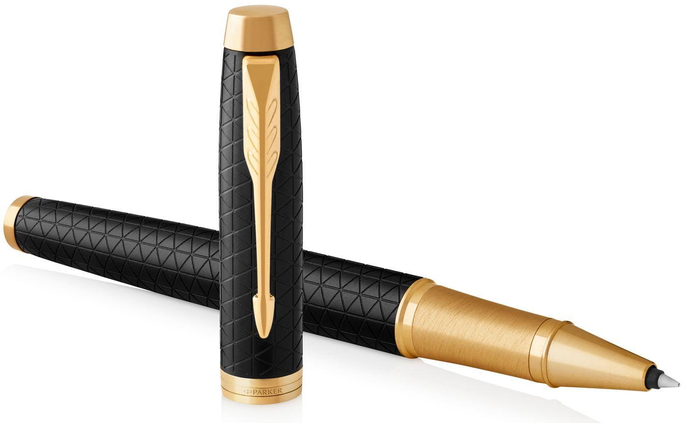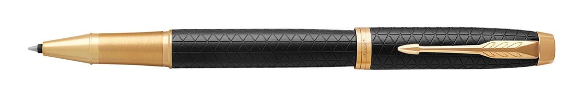 To pióro kulkowe to solidny partner. Inteligentny, pewny i profesjonalny. Linia Parker IM to wykończenia oddające najlepszą tradycję marki. Każdy detal pióra kulkowego IM Premium zaprojektowany został tak, by zapewnić niezawodność pisania. Aluminiowy korpus jest polerowany, anodowany na czarno i dodatkowo grawerowany laserem. Grawerowany wzór jest ponadczasowy, subtelnie podkreśla wykończenia. Pierścienie wykończone złotem. Część przednia szlifowana i powlekana złotem.