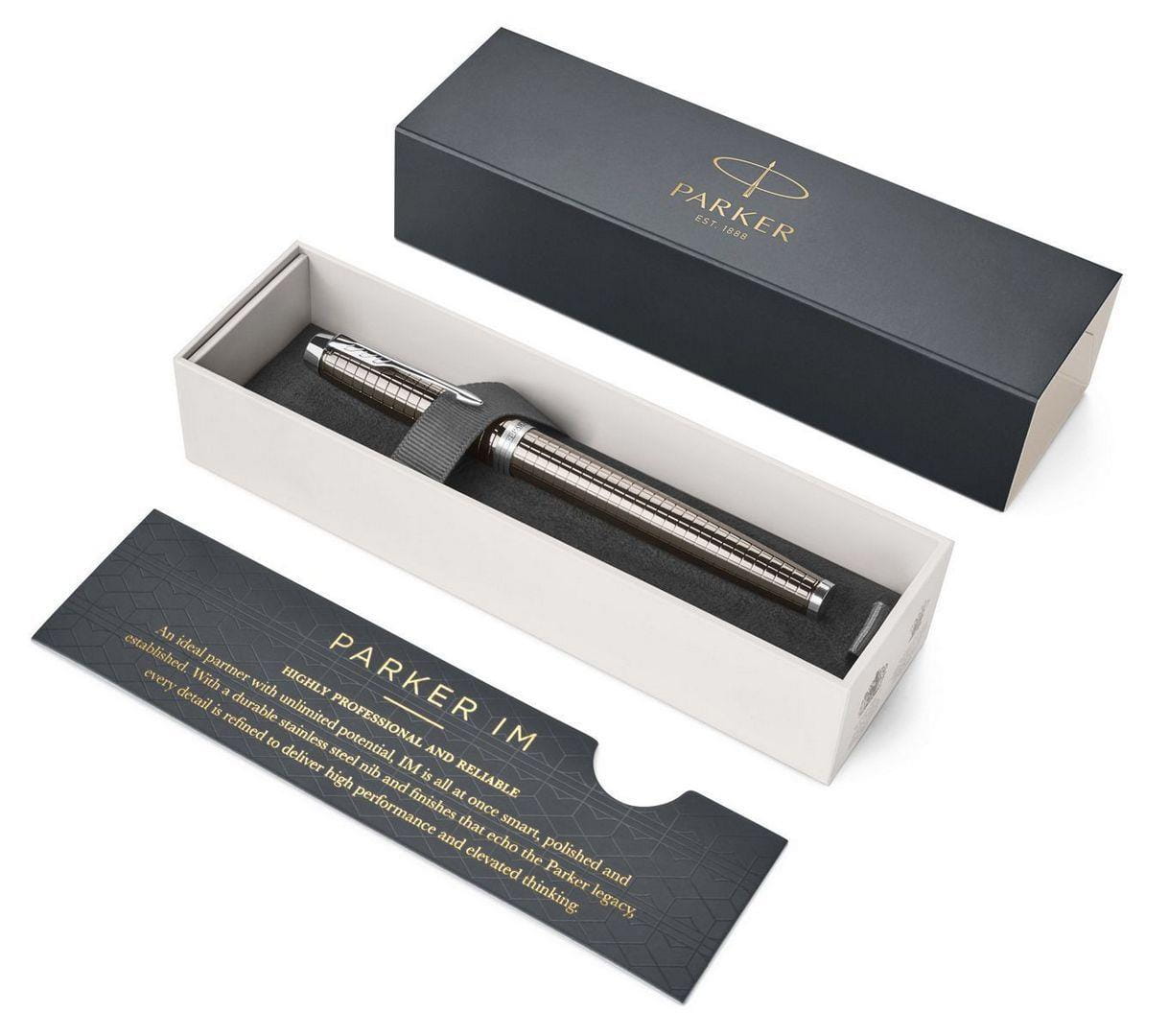 Nowe spojrzenie na klasyczne produkty z linii IM Premium. IM transformacje to produkt w odświeżonej, nowej odsłonie. Odpowiedni dla osób aspirujących do bycia specjalistami w swoich dziedzinach i potrzebujący wywierać świetne pierwsze wrażenie. To pióro wieczne to solidny partner. Inteligentny, pewny i profesjonalny. Linia Parker IM to stalówki ze stali nierdzewnej i wykończenia oddające najlepszą tradycję marki. Każdy detal pióra wiecznego IM Premium zaprojektowany został tak, by zapewnić niezawodność pisania oraz perfekcyjny wygląd. Mosiężny korpus jest chromowany i cyzelowany. Wyczuwalny pod palcami grawerowany wzór jest ponadczasowy, subtelnie podkreśla wykończenia. Pierścienie oraz część przednia chromowane i polerowane; korpus i skuwka w kolorze grafitowo-stalowym.