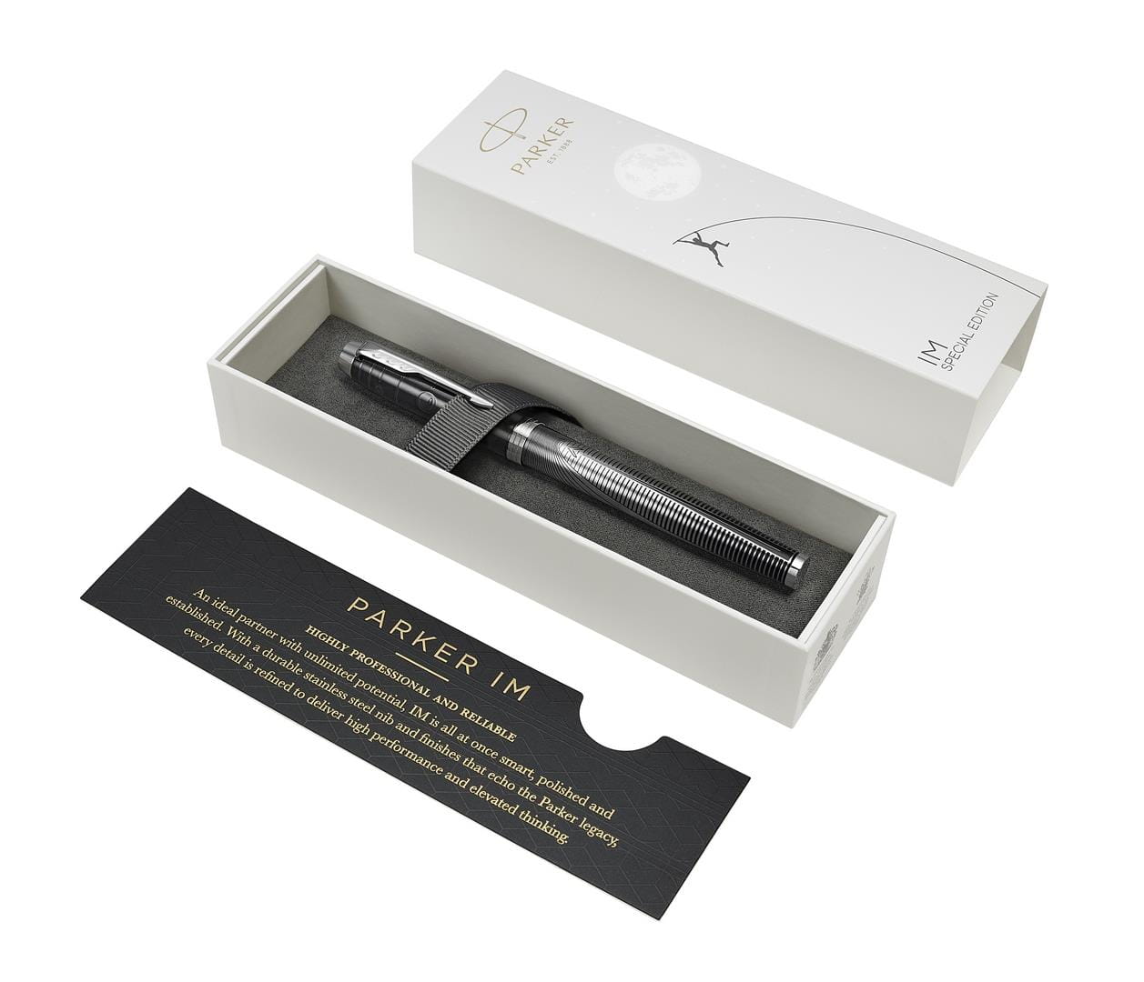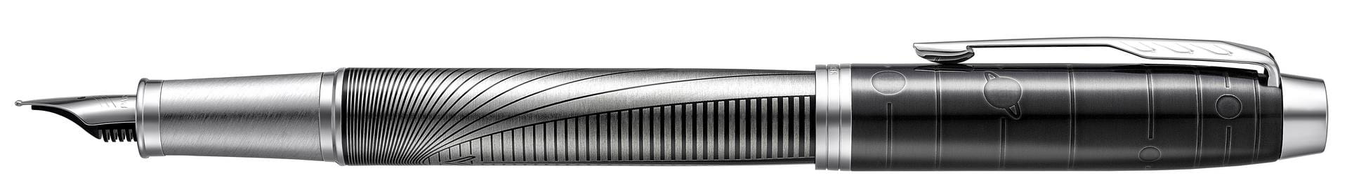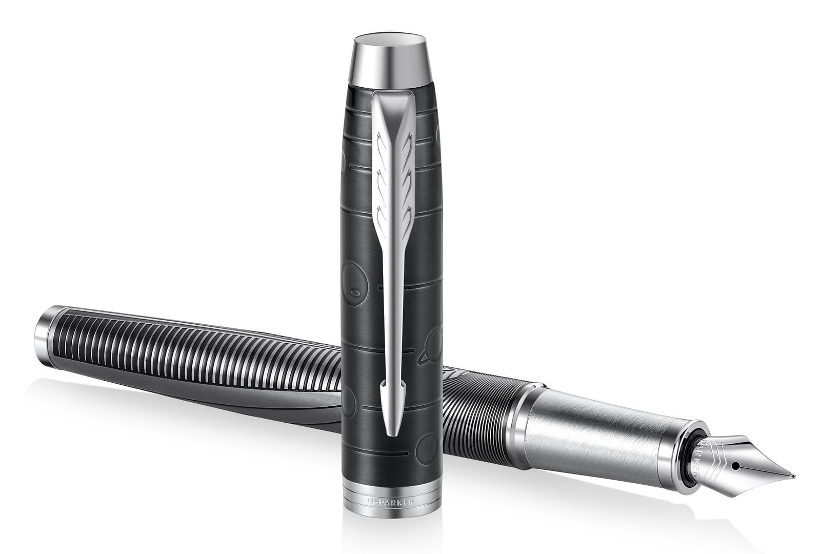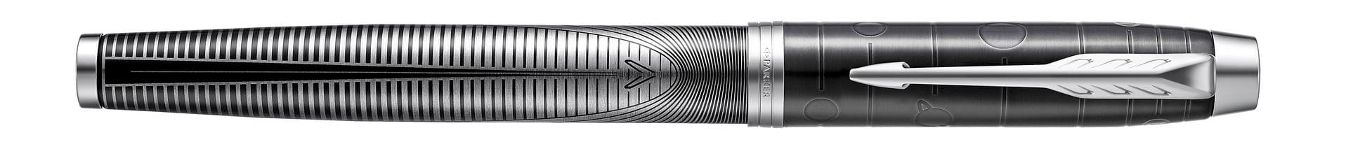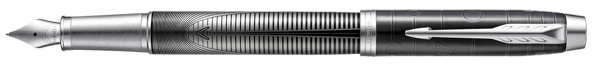 Pióro wieczne Metallic Pursuit z Edycji specjalnej IM inspirowane jest nieograniczonymi możliwościami, które kierują nas do naszego celu. Zarówno skuwka jak i korpus zostały ozdobione żywym wzorem, który przypomina, że droga sukcesu dla każdego jest inna i tylko my, jako jednostki, możemy w nią wyruszyć. Dynamiczny i wyrazisty wzór linii stali nierdzewnej, korpus pokryty czarnym lakierem, wytrawiana czarna skuwka o wysokim połysku oraz klip zdobiony rozpoznawalnym znakiem strzały kierują nas na drogę sukcesu, wyznaczając konkretny i jasny kierunek. Pióro zostało starannie wykończone zgodnie z wysokim standardem symbolizującym doświadczenie i kunszt marki Parker. Stalówka ze stali nierdzewnej.