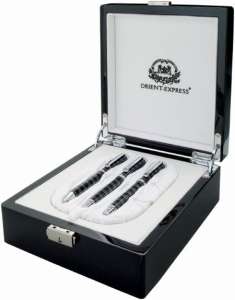 Elegancki zestaw piśmienniczy Orient-Express. W skład zestawu wchodzi eleganckie pudełko, ściereczka, długopis oraz dwa pióra. Pudełko jest otwierane od góry. Wykonane z wysokiej jakości materiału.